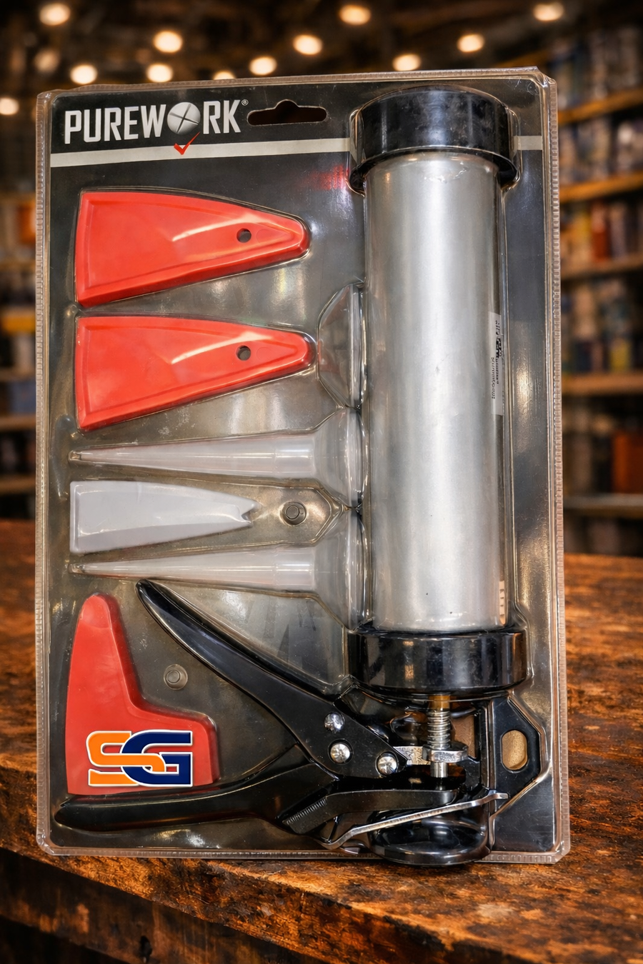 طقم مسدس سيلكون عملي لأعمال العزل والتركيب، يشمل مسدس قوي مع رؤوس متعددة لتوزيع السيليكون بدقة وسهولة، مناسب للاستخدام المهني والمنزلي.